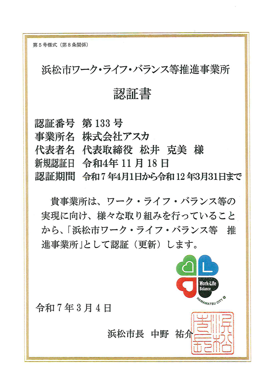 浜松市ワークライフバランス等推進事業書認定